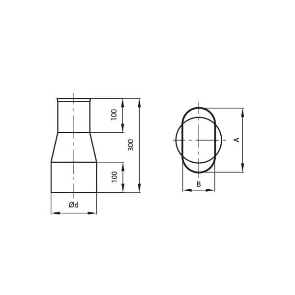 Element that allows to change the chimney duct from oval to round. There is a round muff on one side and an oval one on the other.