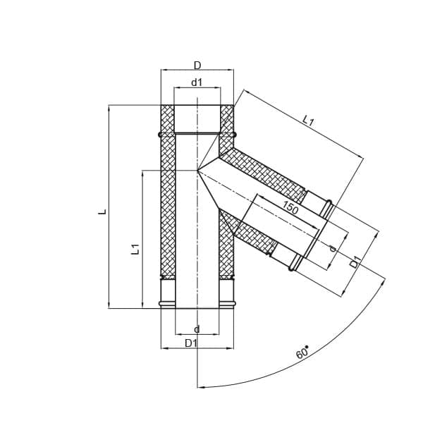 Insulated element used for connecting the flue or the boile outlet at the right angle with the chimney’s vertical section. Connection angle 60 degrees.