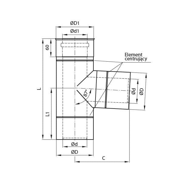 Element used for connecting the flue or the boiler outlet at a proper angle with the vertical section of the chimney liner. Connection angle 87 degrees.